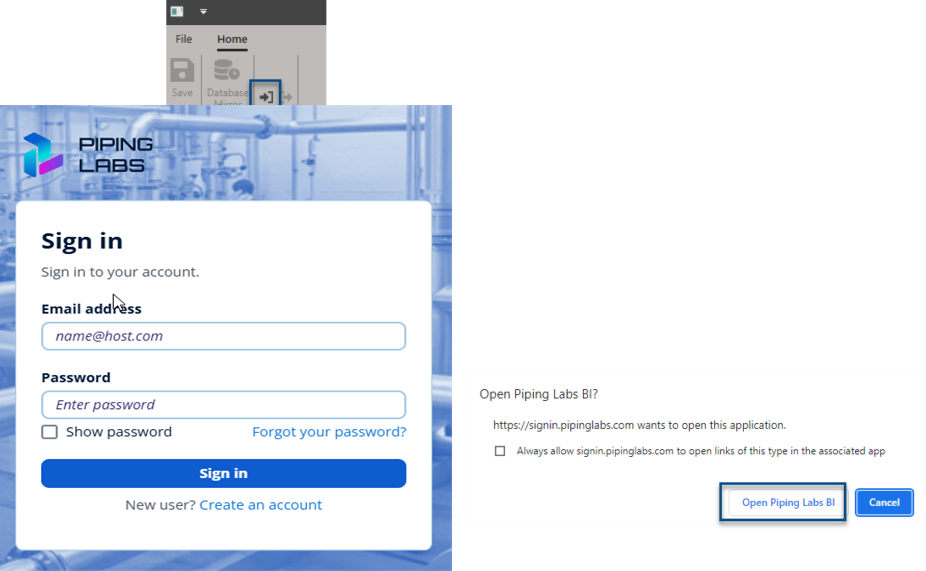 After having created an account, you will be able to login to the app. Click the Login button, enter your credentials, and allow the website to open Piping Labs BI.