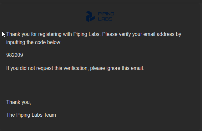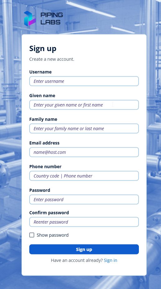 Click the Login with Piping Labs ID. This will take you to the login page which will allow you to sign up or sign in. Click Sign Up. Populate the sign up form with your information. Note that the phone number for US numbers should begin in +1. Click the Sign Up link at the bottom of the login page to go to the create account page.