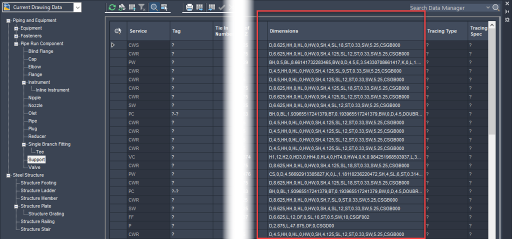We added a couple options for getting pipe support data into your projects/reports. First is a command UPDATESUPPORTDIMENSIONS which will update database information for all the pipe supports in a drawing. Next we also added a reactor to object modify and object appended events, so that when you place a new support in Plant 3d, the Dimension property is automatically update.
